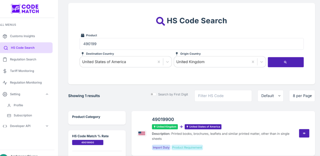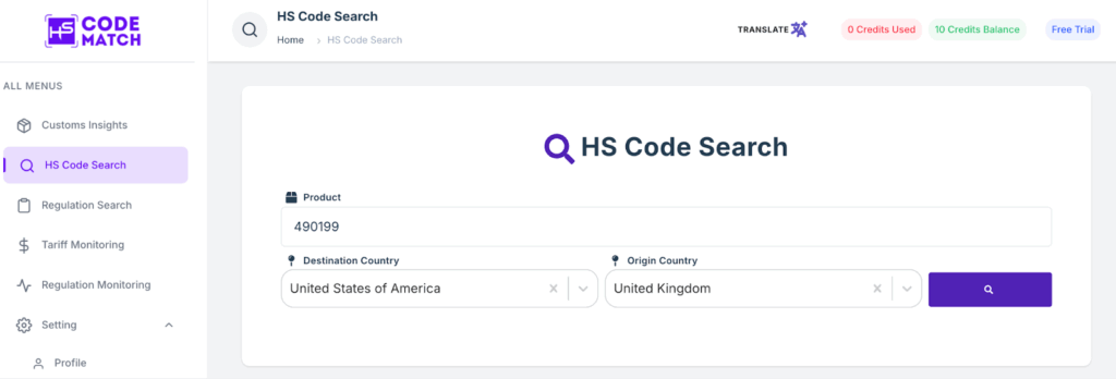 Step 1: Open the HS Code Match by clicking hscodematch.com. You can set the product’s name and the country of origin, as well as the recipient country, on HS Code Search. For instance, of the trade lanes, we can use one of the largest exporters and importers of books, such as sending books under HS code 490199 from the United Kingdom to the United States.
