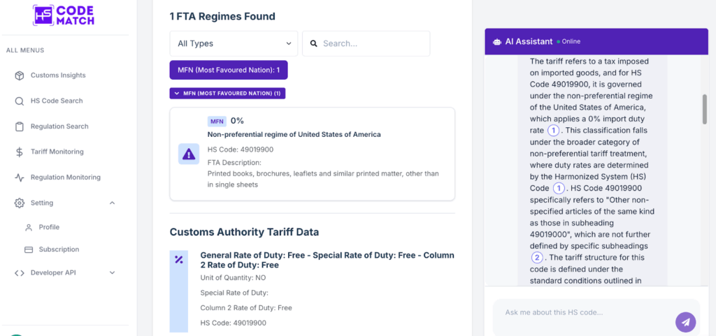 Step 4: In order to find more about the trade regulations, you can move to the bottom part of the page to use the AI Assistant on HS Code Detail. The AI chatbot on HS Code Match will help you find the specific parts of the trade regulation to export books from the United Kingdom to the United States.