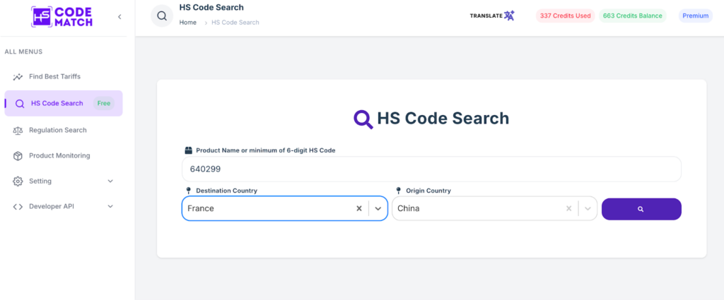 - First step: Open the HS Code Match application by clicking hscodematch.com on your browser. Then, find the HS Code Search and set the country of origin and destination, along with the goods name. For this example, we can choose based on the largest exporting and importing countries for footwear under HS code 640299, such as China to France.