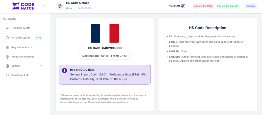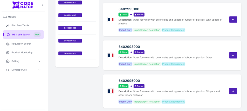 - Second step: HS Code Match will provide the best preference HS code for your products under the HS code 640299. For this example, we can select the product for slippers under the HS code 6402995000 in France.