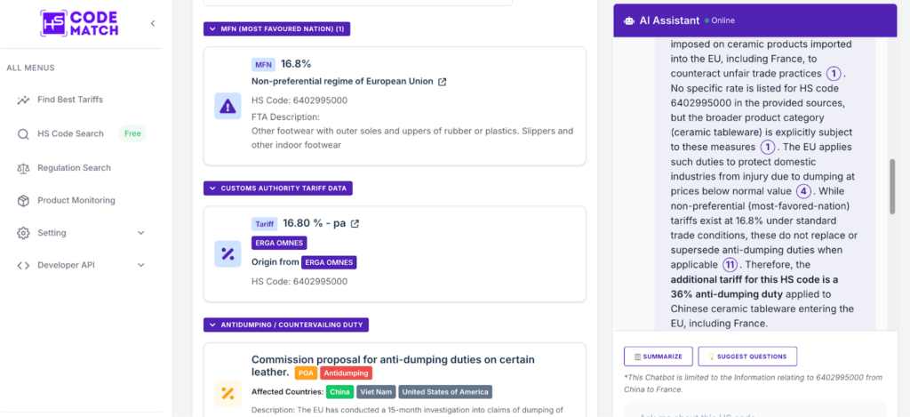 These are examples of an AI chatbot’s answers for exporting slippers under HS code 6402995000 from China to France: