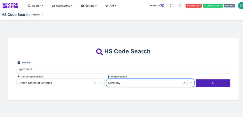 - Step 1: You can open the HS Code Match in your browser. In these steps, we can choose one of the largest importers and exporters of garment products, for instance, the garments from Germany to the United States.
