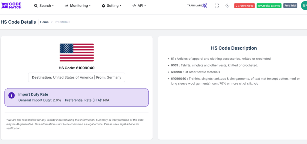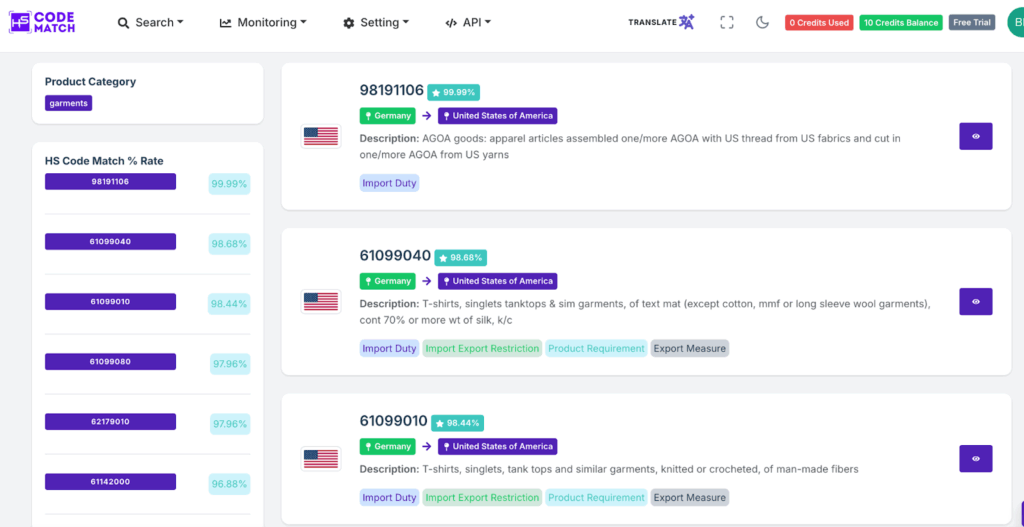 Yes, you can use the HS Code Match to find the accurate HS code for garment products or other products. You can also find the latest trade regulations in HS Code Match to help you solve the problem in international trade.