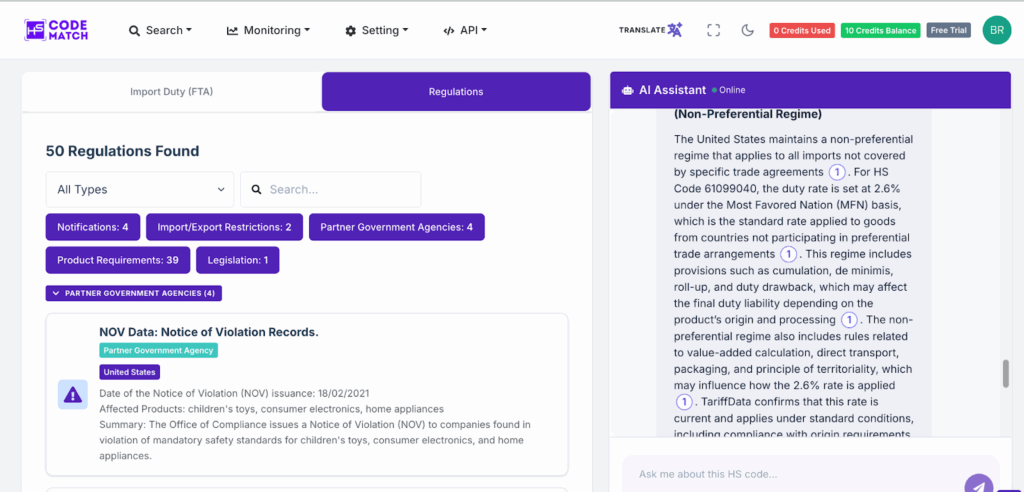 - Step 4: On the bottom part of the HS Code Match page, you can see the import regulations under the code 61099040 to the United States, including Partner Government Agencies, along with the restrictions and the product requirements. If you find any confusion in finding the latest regulation, you are allowed to ask the AI Assistant anything to help you find the right answer or specific parts of the regulations. You can find the summary of HS code 61099040 using the chatbot below.