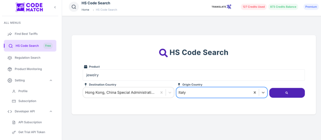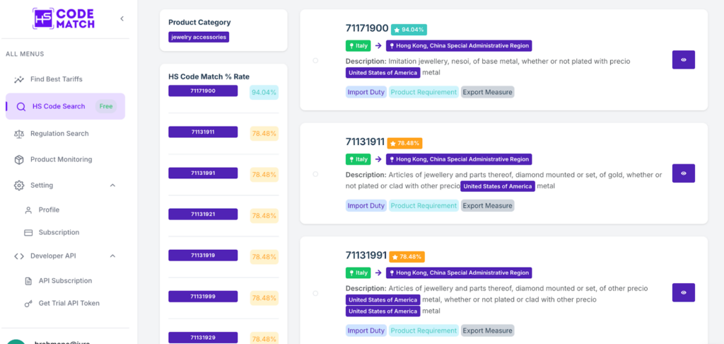 We know that finding an HS code for jewelry is challenging due to the reasons above. However, finding the accurate HS code for jewelry is a requirement in order to comply with the international trade rules. It also allows you through the customs process easily and quickly obtain customs clearance. In order to avoid declaring the inaccurate HS code for jewelry, the HS Code Match offers the best tools to find the HS code or international trade regulations. This is the way to find the accurate HS code for jewelry under the HS code 711319 using HS Code Match: