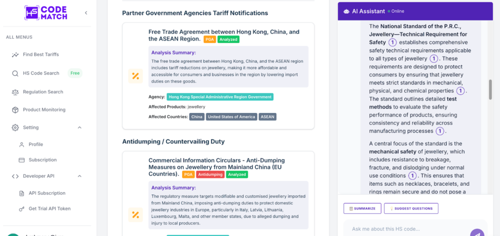 - Fourth step: On the bottom part of the HS Code Details page, you can find the details of the regulations, including Partner Government Agencies (PGAs), Antidumping, FTA, and other things about international trade. If you find confusion, please use the AI Assistant to help you locate parts of the document that you might find difficult to understand.