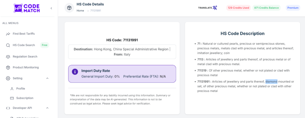 - Second step: The HS Code Match will find the best preference based on the lowest tariff rates. However, you can find the relevant HS code that is closest to your products, including jewelry or other related goods. For example, we can choose the precious diamond jewelry under the HS code 71131991 from Italy to Hong Kong.