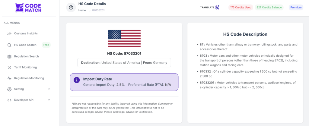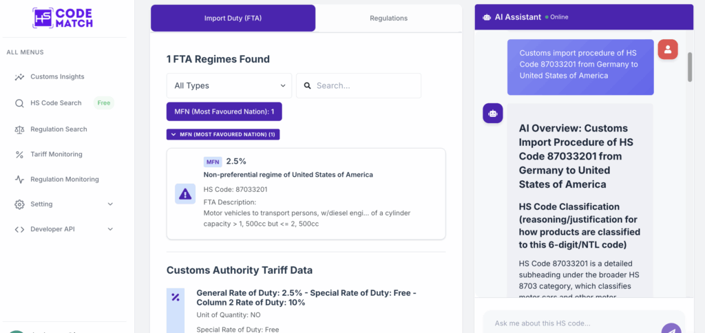 Not only identify what a commodity code or HS code is based on your products, but HS Code Match also provides an AI Assistant to help you find the specific part of the regulation or HS code that you want to know more about or need to be explained. This feature is easy to use; you only need to ask everything that you want to know about the regulation that you are looking for, and the AI Assistant will give you an answer.