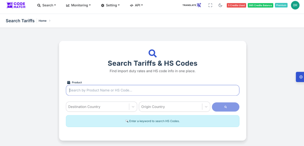 Before using HS Code Match, you should define the products and countries you are from and the destination country first. Then, set the product, destination, and origin country in their brackets. Once it is set, you can click the Search button.