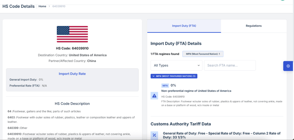 On the HS code details page, you find the information related to HS code description, import duty (FTA), and regulations between the two countries. You are allowed to know more about the detailed information by clicking on the regulation and import duty on a specific country and the goods.