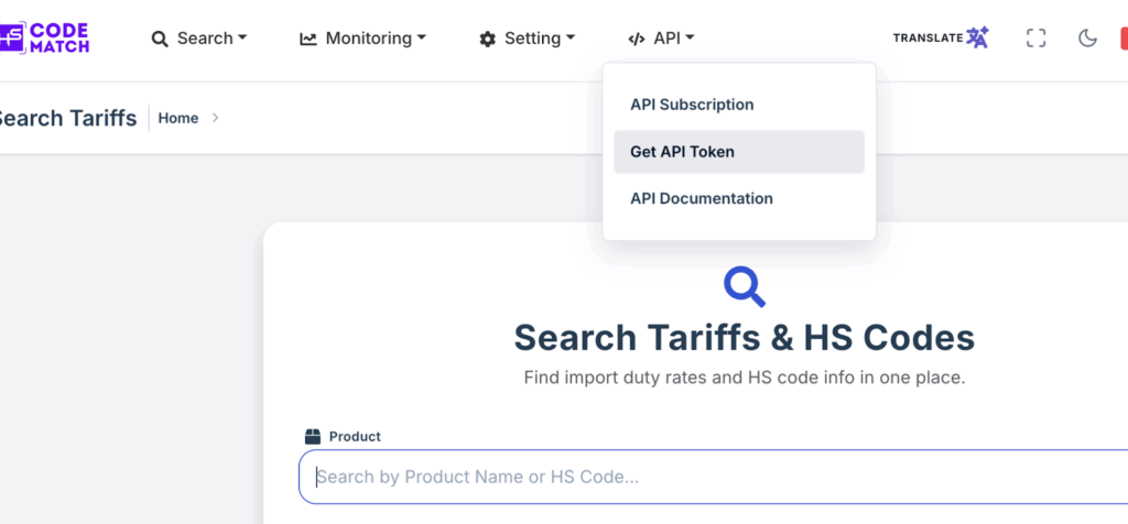 HS Code Match required users to use an API token to connect to their service. You can find the API token in the API Token Management. First, open the API option on the home HS Code Match page and click Get API Token.