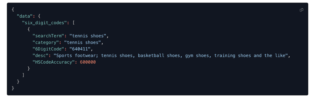 Next, you can check whether the HS Code Match APIs are connected or not. If HS Code Match is successfully connected, it would give example responses as follows: